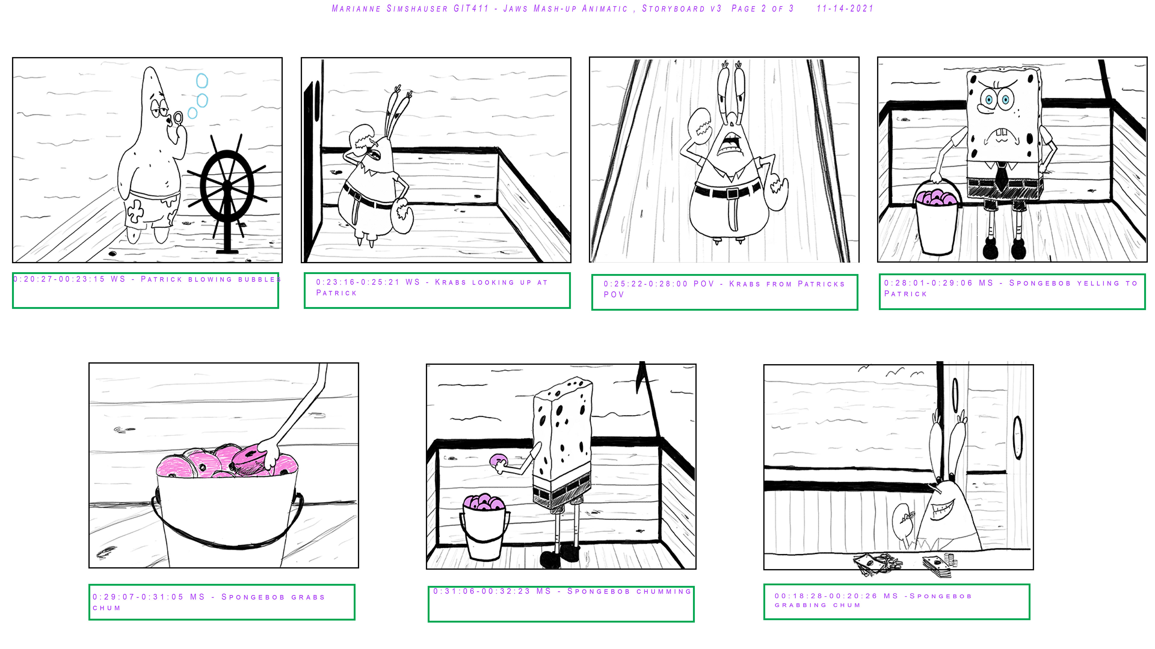 The challenge was to re-envision and animate two complimentary yet contrasting genres without losing the original meaning of either. Using the classic “Bigger Boat” scene from Jaws and the three main characters from SpongeBob SquarePants, an animatic was created that injected the fun of SpongeBob into the surprising reveal of the titular character of Jaws.